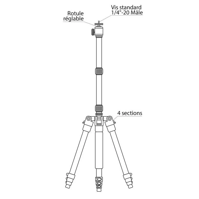 Le trépied a 4 sections, avec verrouillage des pieds à levier (PQL) et en aluminium de haute qualité. Le réglage est simple et efficace, pouvant être ajusté par sections, gagnant en stabilité et en rigidité.